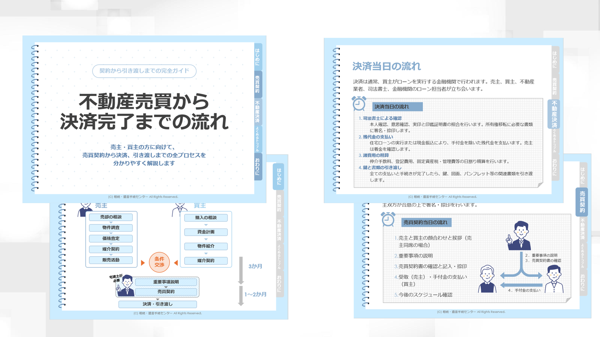 不動産会社の担当者が顧客への説明にそのまま使える「売買契約から決済・引き渡しまでの流れ」をまとめたレジュメです。提携先向けのサポートに幅広くご活用ください。