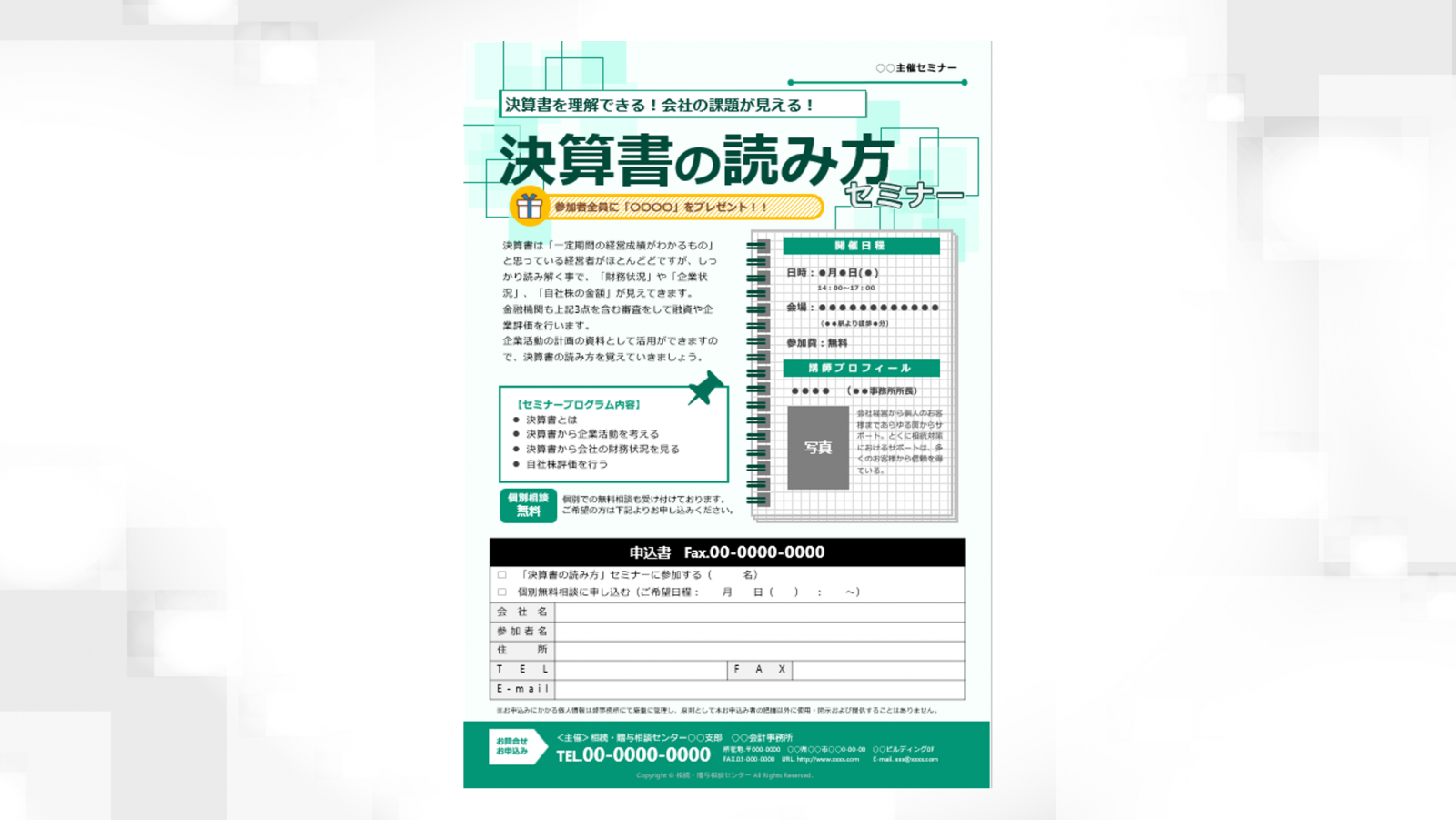 決算書の読み方セミナーチラシ決算書の読み方セミナーレジュメとあわせてお使いいただけるセミナー集客用のチラシです。事業所様や関与先様との打ち合わせの際、案内物としてご活用ください。