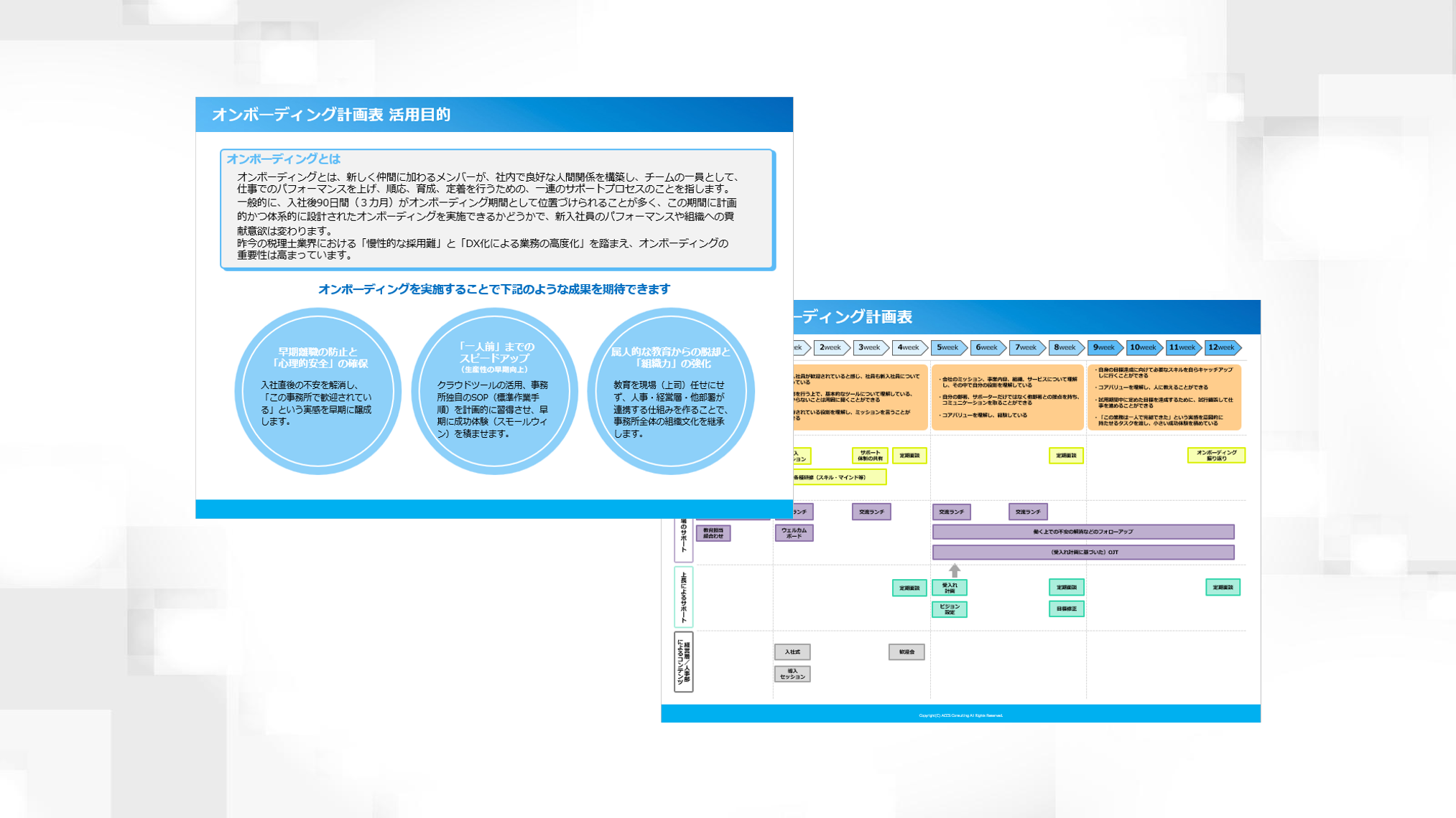 オンボーディング計画表事務所に新しく入社する職員が社内で良好な人間関係を構築し、チームの一員として、仕事でのパフォーマンスを上げられるようになるための、一連のサポート計画を立てる際にご活用いただけます。