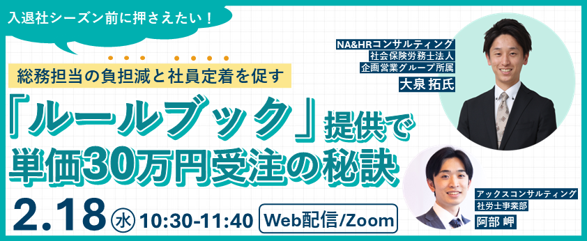 新年度を控え、顧問先企業の総務負担と人事リスクが急増するこのタイミングは、人事・労務関連のご相談が増える時期かと思います。特に、就業規則や労務に関するトラブルは新しく人が入ったタイミングで起こりがちです。本セミナーでは、そのようなタイミングでぜひ活用いただきたい「ルールブック」の設計法から、他事務所と圧倒的に差別化する高単価受注のノウハウまで公開します。