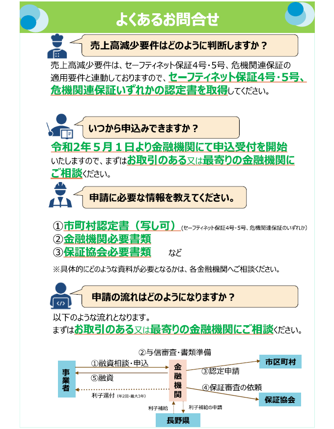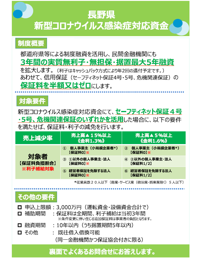 コロナの影響により、資金繰りが悪化した事業者さまや企業さまの資金不足をサポートして頂ける県の融資制度です。
