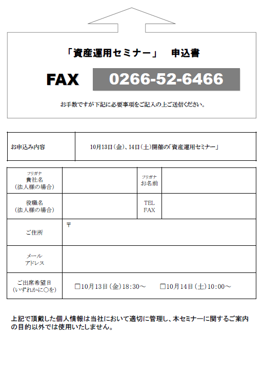 各回30名様限定の無料のセミナーとなっておりますので、ご出席いただける方は、税理士法人三澤会計(0266-52-5544)か、申込用紙でFAX(0266-52-5545)までご連絡ください。