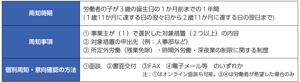 また、3歳未満の子を養育する労働者に対して、子が3歳になるまでの適切な時期に、上記で選択した措置の周知と制度利用の意向の確認を個別に行わなければなりません。