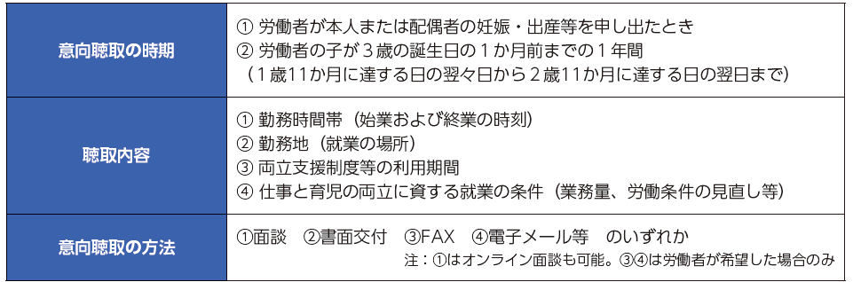 労働者が本人または配偶者の妊娠・出産等を申し出た時と労働者の子が3歳になるまでの適切な時期に、子や各家庭の事情に応じた仕事と育児の両立に関する労働者の意向を個別に聴取し、労働者の仕事と育児の両立に関する意向について、自社の状況に応じて勤務時間帯や業務量の調整や、労働条件の見直しなどの配慮をしなければなりません。