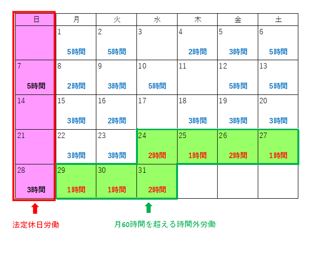 日曜日の休日労働を除き、1日~31日まで合計すると、時間外労働が70時間となります。