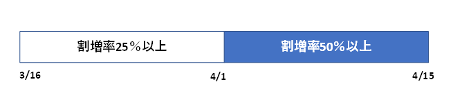 3/16~3/31:65時間、4/1~4/15:15時間 ⇒ 15時間分が割増率50%の対象