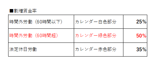 このうち、1日~23日までの時間外労働の合計が60時間となることから、24日~31日の時間外労働10時間分が50%の割増率となります。