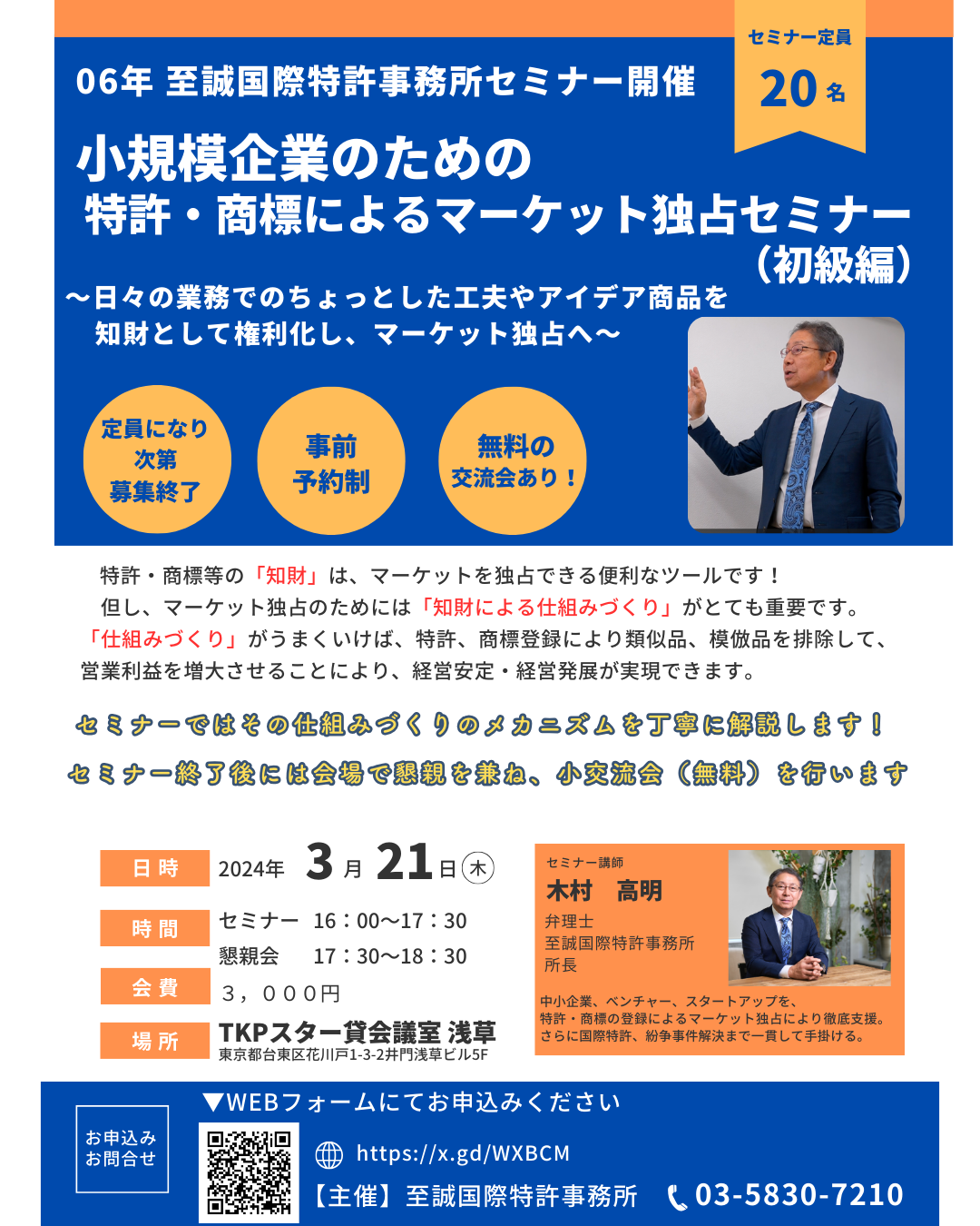 このたび、「小規模企業のための特許・商標によるマーケット独占セミナー(初級編)」を開催いたします。