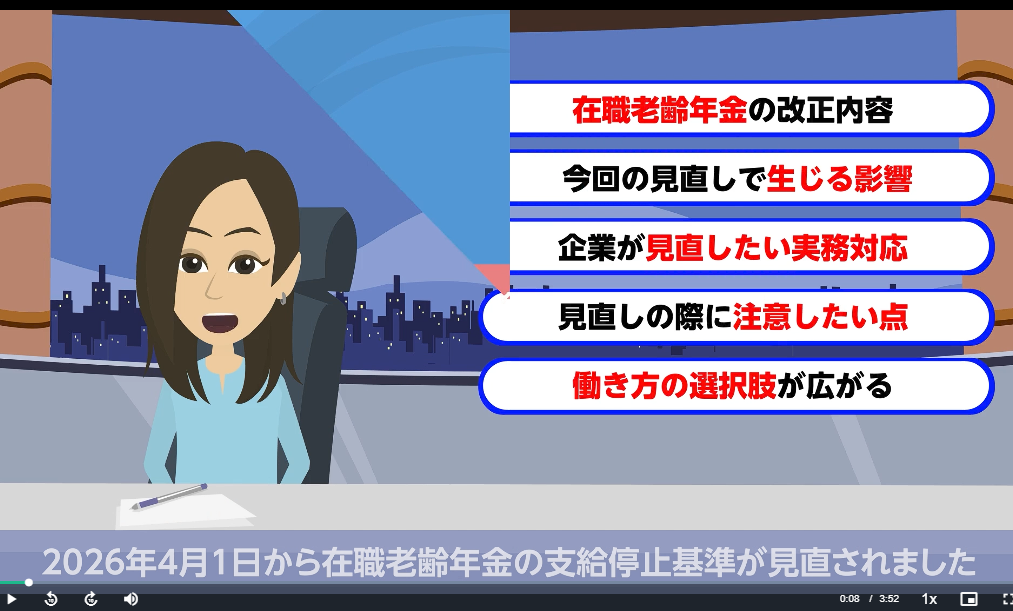 本日は「動画で解説!!2026年改正 在職老齢年金の支給停止基準引き上げのポイント!」をお送りします。