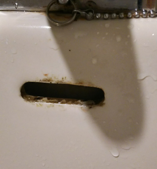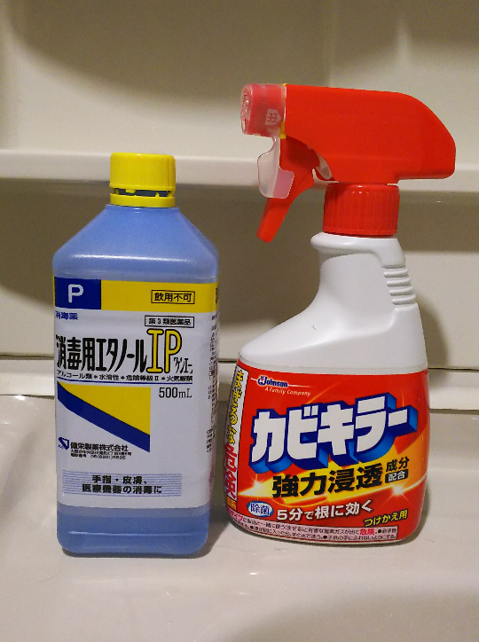 洗面所ではエタノールで黒カビをはがし取り、次にカビ取剤で漂白して、できあがりです。3分ほどの作業で終了します。