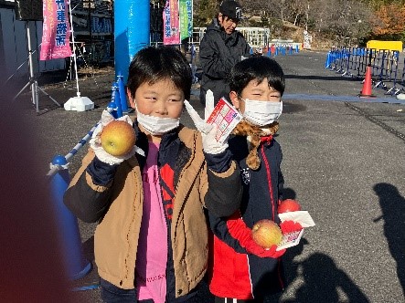 恒例のゴールでのりんご配りも、可愛らしい子供たちが笑顔で配って大活躍。