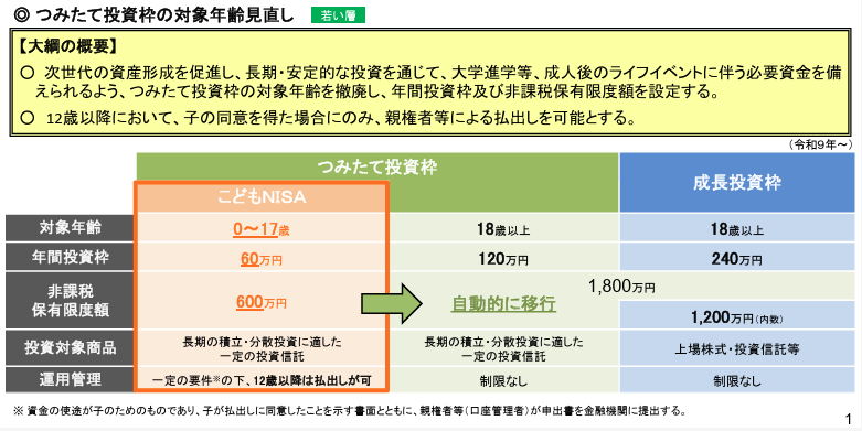 NISA口座の口座開設可能年齢の下限が撤廃されます(現在は18歳以上)。0歳~17歳に対しては新たにつみたて投資枠(年間投資枠60万円・非課税保有限度額600万円)が設けられます(こどもNISA)。